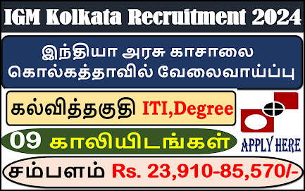 IGM Kolkata Recruitment 2024| India Govt. Mint, Kolkata|இந்தியா அரசு காசாலை கொல்கத்தாவில் வேலைவாய்ப்பு புதியதாக அறிவிக்கப்பட்டுள்ளது. கல்வித்தகுதி ITI,Degree|சம்பளம் Rs. 23910-85570/-|இந்த பதவிக்கு விண்ணப்பிக்க ஆர்வமுள்ளவர்கள் அதிகாரப்பூர்வ இணையதளமான https://igmkolkata.spmcil.com/இல் ஆன்லைனில் விண்ணப்பிக்கலாம்.மேலும் தேர்வு முறை, காலிப்பணியிடங்களின் விவரம் போன்ற தகவல்களை தெரிந்து கொள்ள கீழே காணலாம்.